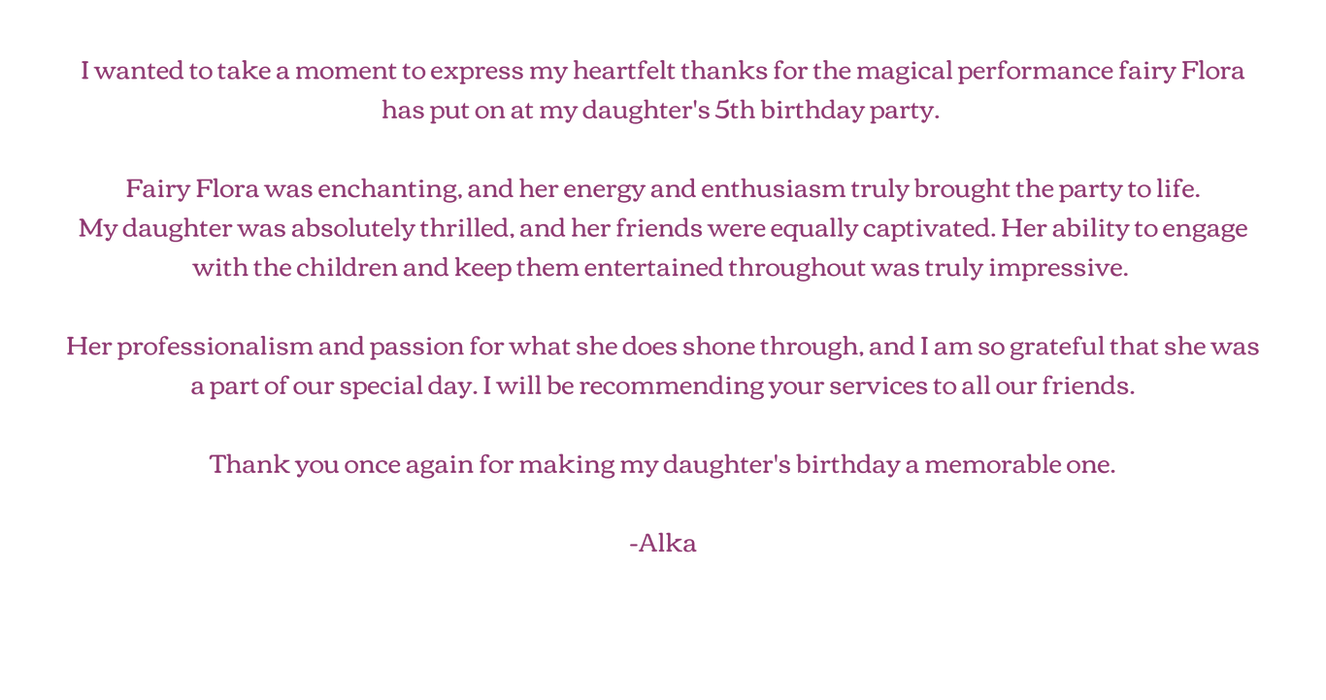 Our performers undergo intensive training to perfect their walk, talk, and mannerisms, so that your child believes they are meeting a real fairy.